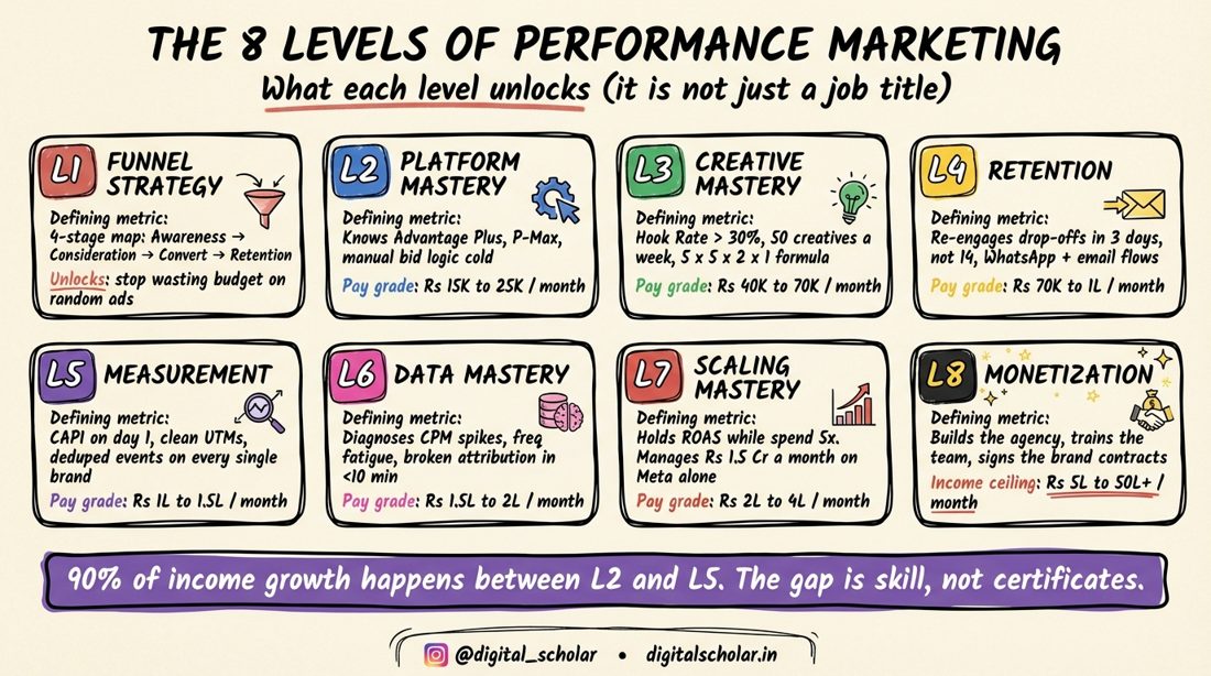- Performance marketing in 2026 is 8 levels, not 1 job title. Funnel strategy, platform mastery, creative volume, retention, measurement, data, scaling, monetization – each unlocks a distinct income tier from Rs 15K/month to Rs 5L+/month.