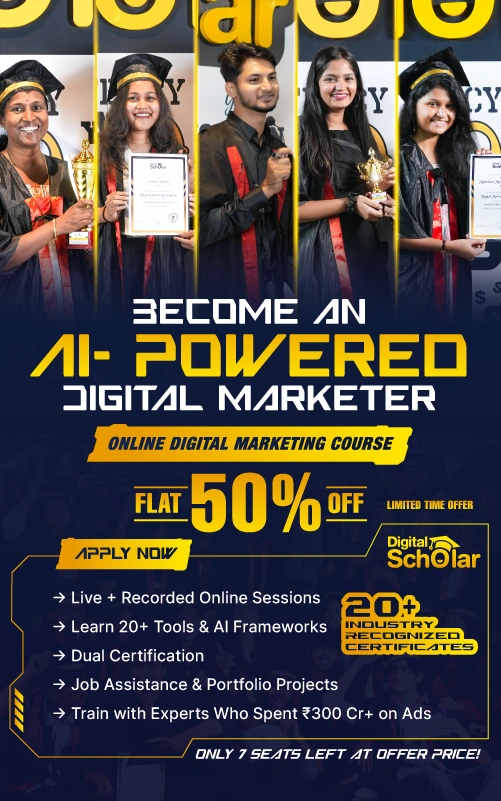 Take an online digital marketing course by Digital Scholar with AI-powered updated modules & dual certification that covers all the major digital marketing modules with agency-style learning to explore your creative side and bring out the best to make you a successful digital marketer.